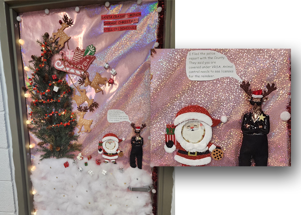 County Administrator Ramona Wilson featured VRSA in the county’s holiday door decorations! The message reads: “I filed the police report with the County. They said you are covered under VRSA. Animal control needs to see licenses for the reindeer.”